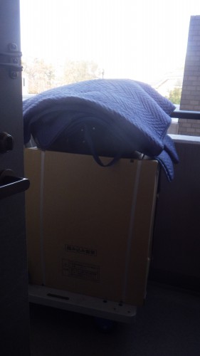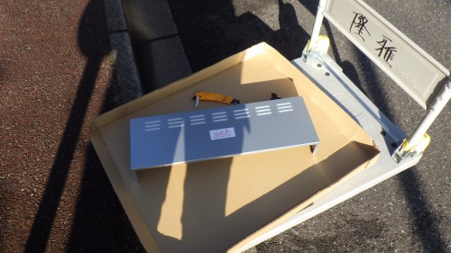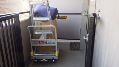 新しい換気扇・道具・養生用の絨毯を台車に乗せてお客様宅にお伺いします。
