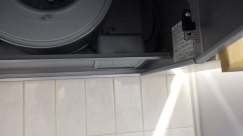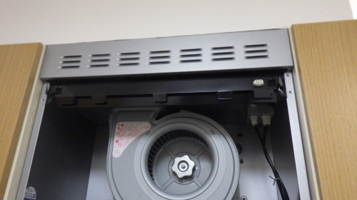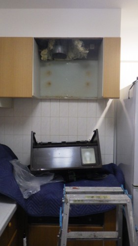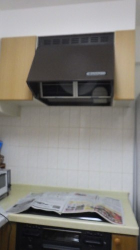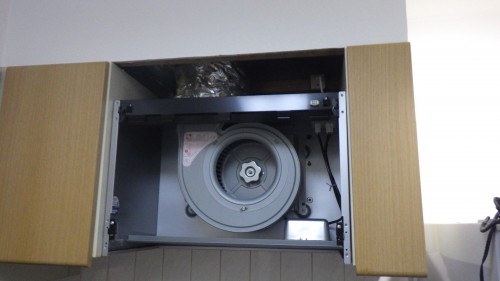 舎人公園近くに建つ12階建てのマンションの2階にお住まいの方よりシステムキッチンに組込まれているシロッコファン(換気扇)の交換工事ご依頼です。