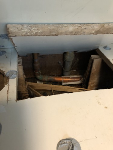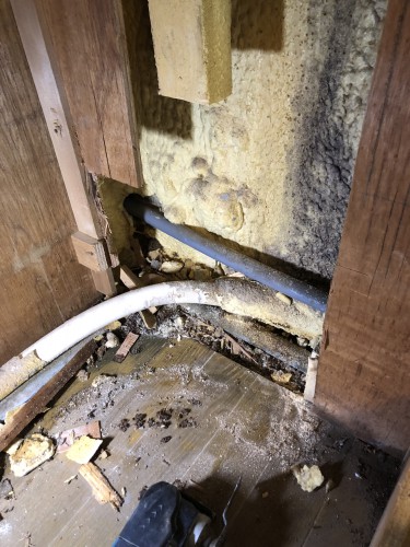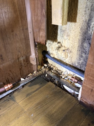 収納部を開口し給湯管を目視にて確認します。給湯配管に腐食はありますが、この部分で漏水はしていないようです。