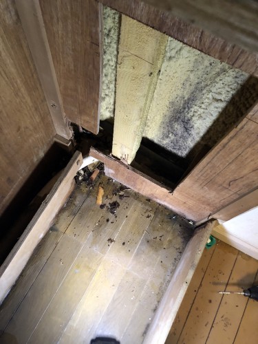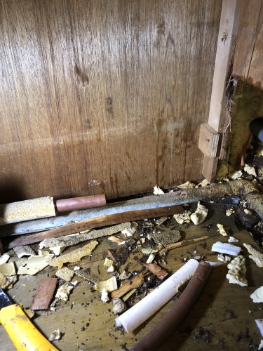 システムキッチンのシンク・水栓金具(蛇口)付近ではなく、ガス調理器具下部付近の床に水が溜まっていたというお客様からの情報を基に、ガス調理機器下部収納に開口を開け、水道管・給湯管など設備配管を調査する事になりました。