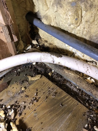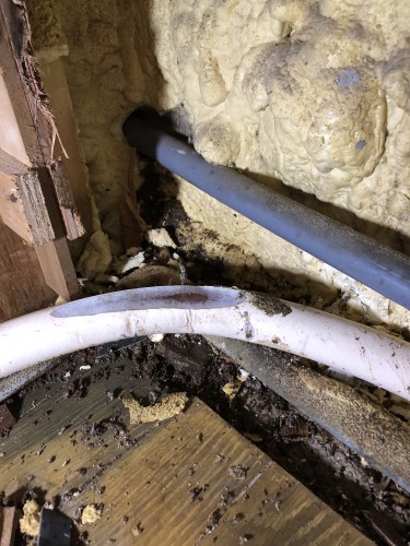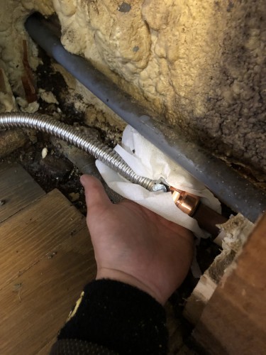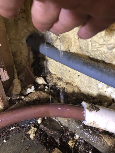 銅製の給湯管に被せてある白色の保温管の内側より水が伝わって来ています。保温管を削り取り確認