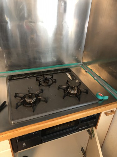 ガス調理機を戻し・システムキッチンと壁の取り合い部分をシーリング処理を施します