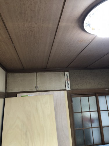 目透かし天井もビニルクロスで仕上げるため、同じく4ミリベニアを捨て張りします。