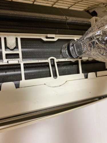 ペットボトルで室内機に水を流しこみ 排水テストを行い