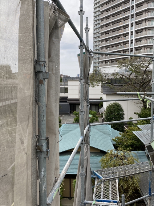 東京都港区青山 表参道交差点の裏手『アニヴェルセル』のチェペル・『育てるタオル』表参道ショールームに隣接する、鉄筋コンクリート3階建て【コンクリート打ちっ放し仕上げ】の事務所ビルで外壁修繕工事真っ只中です。