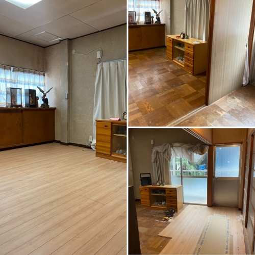 洋室から廊下介して反対側には和室が並んでおり、当然廊下と和室は障子で隔たれており、現在の建具・敷居をそのまま再利用して、修繕するには、既存のフローリングを剥がし同寸法のフローリングを新たに貼り替えるのが最善ではありますが、工期・費用・作業性は良くありません。