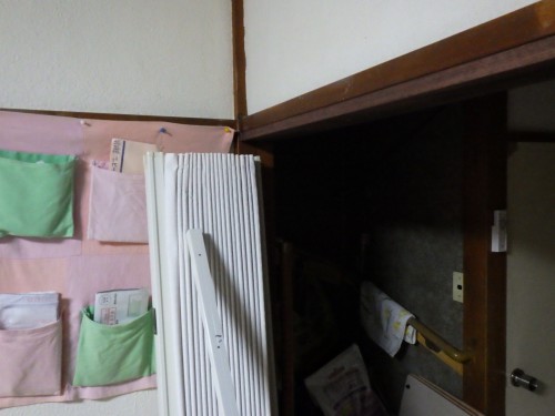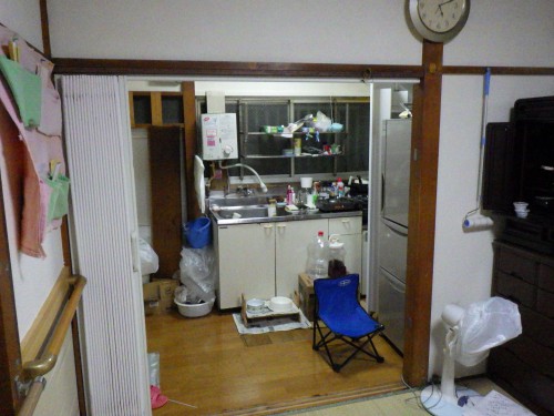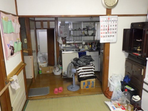 以前は、台所とキッチンを隔てる木製のガラス戸が設置してありました。数年前、おじいさまが体調を崩し、要介護認定された際、ガラス戸に倒れかかっては危険だという事でガラス戸を処分させたようです。