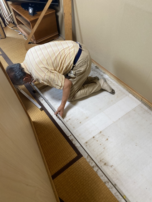 今日は畳製作に先立、畳業界では若手に分類される、70歳ちょっと手前の熟練畳職人さんと一緒にタンスやテレビなどを動かしながら採寸作業を行なっています。